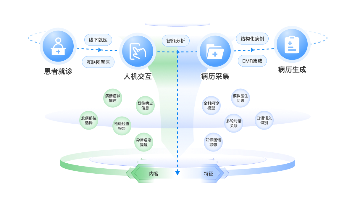 用户就诊前,根据用户的症状,模拟医生的问诊,以人机对话的方式询问用户相关病史信息,并将采集到的病史信息按病历格式结构化,包括主诉、现病史、既往史、过敏史、家族史等,最后生成一份诊前病历给予给医生,能够帮助医生提高接诊效率。